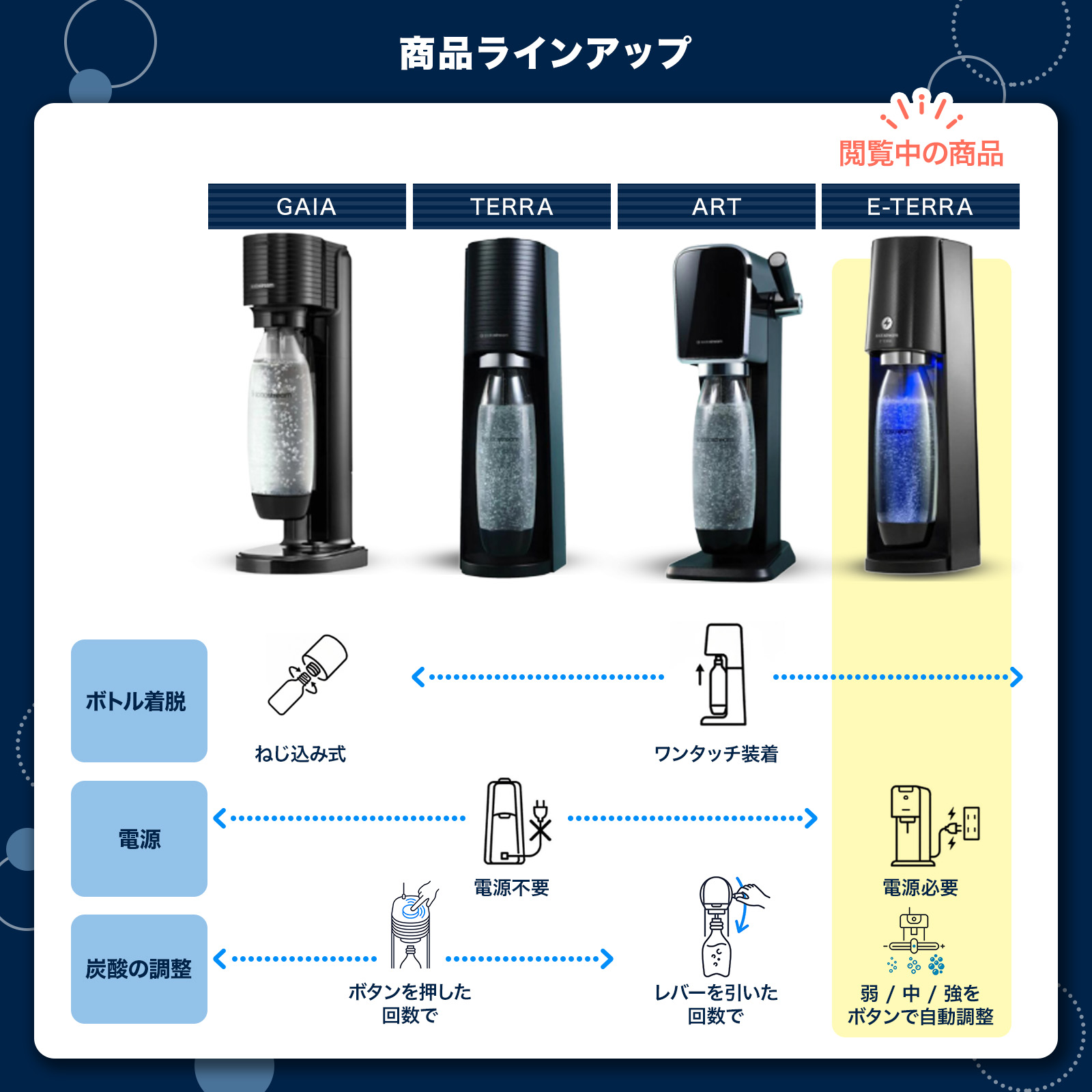 グッドデザイン賞受賞の「TERRA」シリーズのスタイリッシュなデザインを踏襲し、さらに進化させています。炭酸注入時には、清涼感あるブルーのLEDライトが光り気分が爽快。(カラーは人気のホワイト、ブラックの2色で展開。)