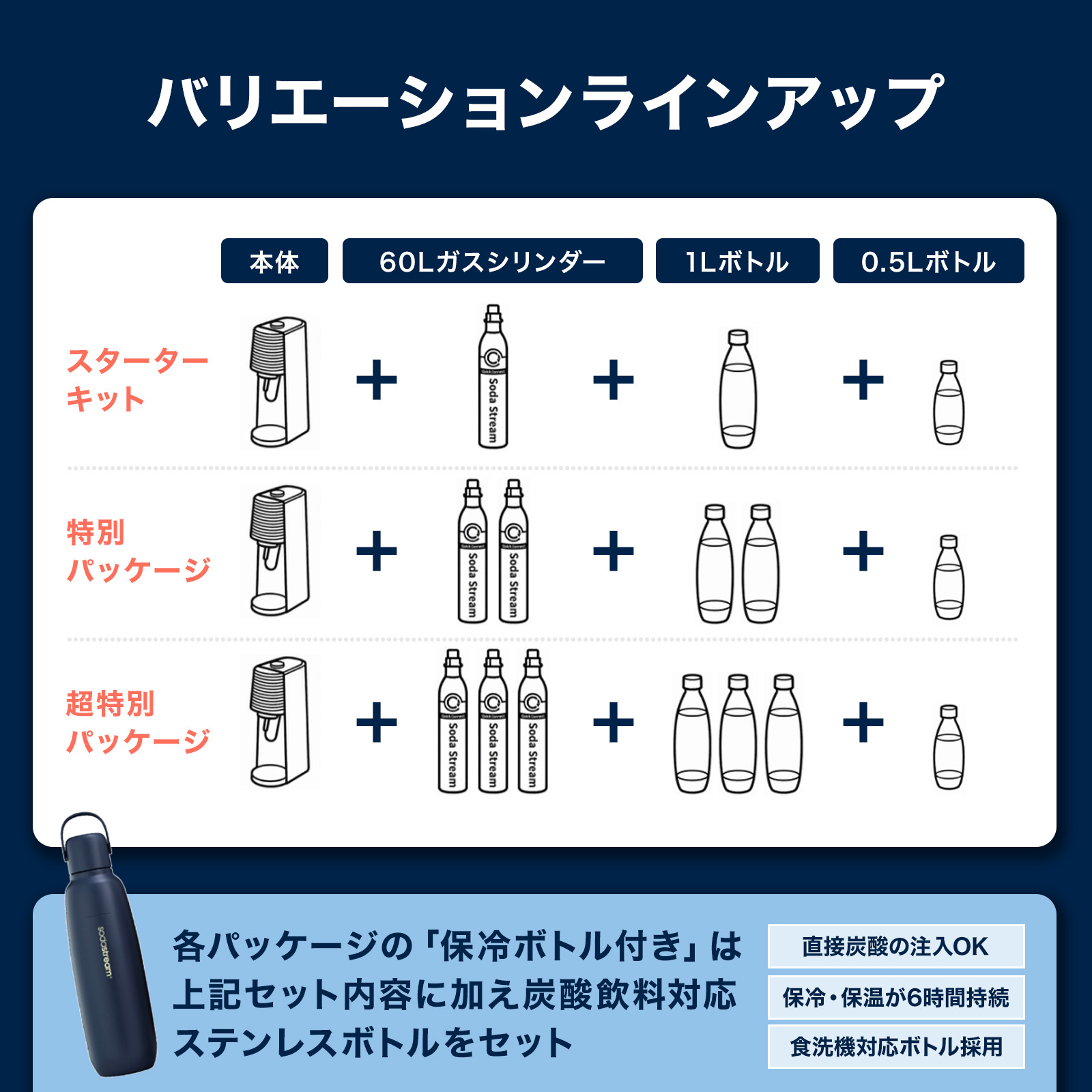 ソーダメーカー本体 x 1 電源アダプター x 1 ガスシリンダー60リットル用 x 2 DWSボトル(キャップ付) 1L x 2 DWSボトル(キャップ付) 0.5L x 1 炭酸飲料対応ステンレスボトル0.9L×1 ユーザーガイド(ユーザーライセンス付き) x 1 ソーダメーカー保証書 x 1 |
